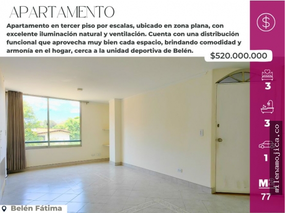 Apartamento en tercer piso por escalas, ubicado en zona plana, con excelente iluminación natural y ventilación. Cuenta con una distribución funcional que aprovecha muy bien cada espacio, brindando comodidad y armonía en el hogar.