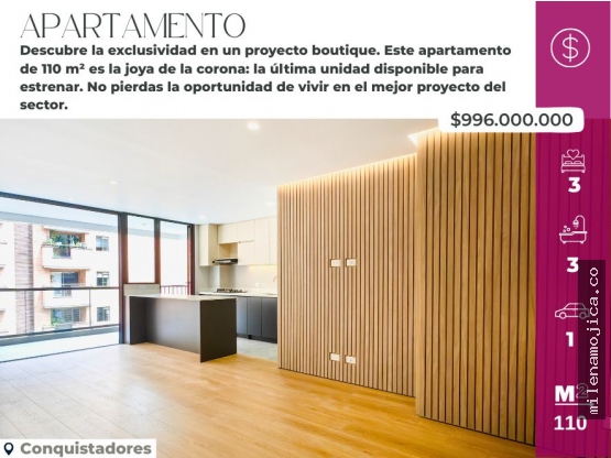 Descubre la exclusividad en un proyecto boutique. Este apartamento de 110 m² es la joya de la corona: la última unidad disponible para estrenar.