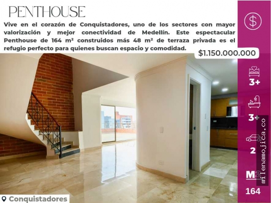 Vive en el corazón de Conquistadores, uno de los sectores con mayor valorización y mejor conectividad de Medellín. Este espectacular Penthouse de 164 m² construidos más 48 m² de terraza privada es el refugio perfecto para quienes buscan espacio y comodidad.